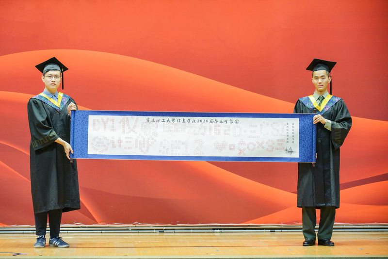 此外,信息学院为2020届全体本科毕业生赠送一枚姓名印章作为纪念。印章内雕部分刻有校徽图案和“勤奋求实,励志名德”的校训字样,印章底部刻有学生姓名。学院希望这枚印章,能够伴随信息学院2020届全体本科毕业生行至远方,不忘人如印章,行得正,坐得端。由于受疫情影响,本科毕业生无法全员返校合影。他们将印有全体455名毕业本科生印章的卷轴赠送给学院,借印章实现相聚,作为留念。